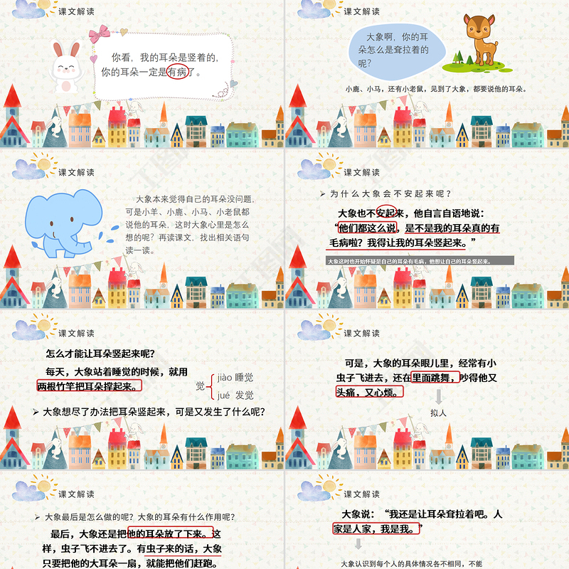 課文解讀 大象啊,你的耳朵怎么是耷拉著的呢? 小鹿、小馬,還有小老鼠,見(jiàn)到了大象,都要說(shuō)他的耳朵。