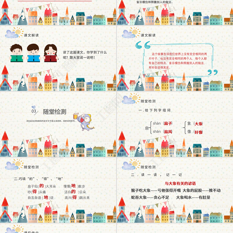 課文解讀 大象說(shuō):“我還是讓耳朵耷拉著吧。人家是人家,我是我?!?大象認(rèn)識(shí)到每個(gè)人的具體情況各不相同,不能盲目模仿和照搬別人的做法。