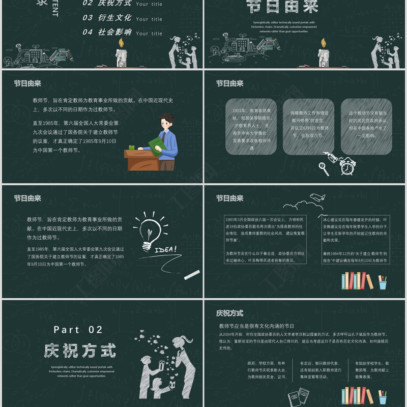<p></p><br><p>目錄CONTENT 01 節(jié)日由來Your title02 慶祝方式Y(jié)our title03 衍生文化Your title04 社會影響Your title</p><br><p>Part 01 節(jié)日由來Synergistically utilize technically sound portals with frictionless chains. Dramatically customize empowered networks rather than goal-opportunities. </p><br><p>節(jié)日由來教師節(jié),旨在肯定教師為教育事業(yè)所做的貢獻。在中國近現(xiàn)代史上,多次以不同的日期作為過教師節(jié)。直至1985年,第六屆全國人大常委會第九次會議通過了國務(wù)院關(guān)于建立教師節(jié)的議案,才真正確定了1985年9月10日為中國第一個教師節(jié)。</p><br><p>節(jié)日由來1931年,教育家邰爽秋、程其保等聯(lián)絡(luò)京、滬教育界人士, 在南京中央大學(xué)集會,發(fā)表要求改善教師待遇保障教師工作和增進教師修養(yǎng)”的宣言,并議定6月6日為教師節(jié),也稱雙六節(jié)。這個教師節(jié)沒有被當(dāng)時的國民黨政府承認(rèn),但在中國各地產(chǎn)生了一定影響。</p><br><p>節(jié)日由來教師節(jié),旨在肯定教師為教育事業(yè)所做的貢獻。在中國近現(xiàn)代史上,多次以不同的日期作為過教師節(jié)。直至1985年,第六屆全國人大常委會第九次會議通過了國務(wù)院關(guān)于建立教師節(jié)的議案,才真正確定了1985年9月10日為中國第一個教師節(jié)。</p><br><p>節(jié)日由來1983年3月全國政協(xié)六屆一次會議上,方明和民進18位政協(xié)委員聯(lián)名再次提出“為提高教師的社會地位,造成尊師重教的社會風(fēng)尚,建議恢復(fù)教師節(jié)案”。為教師節(jié)定在什么日子最合適,政協(xié)委員方明征求過謝冰心、葉圣陶等民進老前輩的意見。冰心建議定在每年春暖花開的時候;葉圣陶建議定在每年秋季學(xué)生入學(xué)的日子,讓學(xué)生在新學(xué)年的開始就記住教師的辛勤和光榮。最終1984年12月的“關(guān)于建立‘教師節(jié)’的報告”中建議確定每年9月10日為教師節(jié)</p><br><p>Part 02慶祝方式Synergistically utilize technically sound portals with frictionless chains. Dramatically customize empowered networks rather than goal-opportunities. </p><br><p>慶祝方式從2004年開始,時任全國政協(xié)委員的人文學(xué)者李漢秋以提案的方式,多次呼吁以孔子誕辰作為教師節(jié)。他認(rèn)為,重新設(shè)定的節(jié)日是由現(xiàn)代人自己擇日的,就應(yīng)當(dāng)考慮這日子是否有歷史文化內(nèi)涵、如何接續(xù)歷史傳統(tǒng)。教師節(jié)應(yīng)當(dāng)是很有文化內(nèi)涵的節(jié)日政府、學(xué)校方面,有舉行教師節(jié)慶祝表彰大會,為教師頒發(fā)獎金、證書。有組織學(xué)校學(xué)生、歌舞團等,為教師獻上歌舞表演。有走訪、慰問教師代表,還有組織新入職教師進行集體宣誓等活動。</p><br><p>慶祝方式香港在敬師日(教師節(jié))當(dāng)天,舉行典禮表彰優(yōu)秀老師,還會統(tǒng)一印制賀卡,學(xué)生可以免費領(lǐng)取后填好贈送給老師??ㄆ?、鮮花、公仔一類小禮物通常是香港學(xué)生對老師表達教師節(jié)祝福最常見的禮物。慰問板報賀卡</p><br><p>慶祝方式香港的敬師運動委員會在每年的9月10日舉辦“敬師日慶典暨表揚狀頒發(fā)典禮”,典禮由學(xué)生樂隊擔(dān)任現(xiàn)場伴奏,家長唱歌的形式表達對老師的感謝和敬意,在現(xiàn)場也會播放師生間的感人故事視頻,體現(xiàn)師生情。此外,敬師會還舉辦“表揚教師計劃”、“師生共育苗”種植活動、征文比賽、心意卡設(shè)計比賽、香港學(xué)校音樂及朗誦節(jié)敬師杯等活動。此外,敬師會還舉辦“表揚教師計劃”、“師生共育苗”種植活動、征文比賽、心意卡設(shè)計比賽、香港學(xué)校音樂及朗誦節(jié)敬師杯等活動。</p><br><p>Part 03衍生文化Synergistically utilize technically sound portals with frictionless chains. Dramatically customize empowered networks rather than goal-opportunities. </p><br><p>衍生文化建立教師節(jié),標(biāo)志著教師在中國受到全社會的尊敬。這是因為教師的工作在很大程度上決定著中國的未來。每年的教師節(jié),中國各地的教師都以不同方式慶祝自己的節(jié)日。通過評選和獎勵,介紹經(jīng)驗,幫助解決工資、住房、醫(yī)療等方面的實際困難,改善教學(xué)條件等,大大提高了廣大教師從事教育事業(yè)的積極性。建立教師節(jié),標(biāo)志著教師在中國受到全社會的尊敬</p><br><p>衍生文化這是因為教師的工作在很大程度上決定著中國的未來。每年的教師節(jié),中國各地的教師都以不同方式慶祝自己的節(jié)日。通過評選和獎勵,介紹經(jīng)驗,幫助解決工資、住房、醫(yī)療等方面的實際困難,改善教學(xué)條件等,大大提高了廣大教師從事教育事業(yè)的積極性。這是因為教師的工作在很大程度上決定著中國的未來。每年的教師節(jié),中國各地的教師都以不同方式慶祝自己的節(jié)日。通過評選和獎勵,介紹經(jīng)驗,幫助解決工資、住房、醫(yī)療等方面的實際困難,改善教學(xué)條件等,大大提高了廣大教師從事教育事業(yè)的積極性。</p><br><p>衍生文化教師節(jié)應(yīng)當(dāng)是很有文化內(nèi)涵的節(jié)日以孔子誕辰作為中華教師節(jié)是非常合適學(xué)生方面,有自發(fā)通過原創(chuàng)參與、將祝福寫在板報、賀卡、繪畫上;有將合影照及活動感言曬至個人空間、微博上,來表