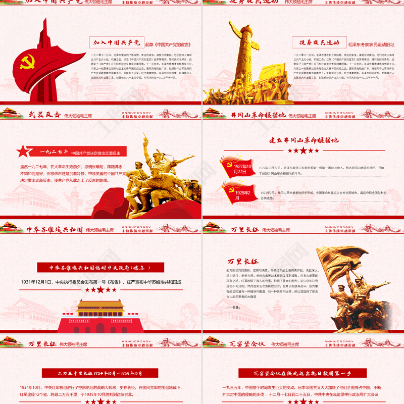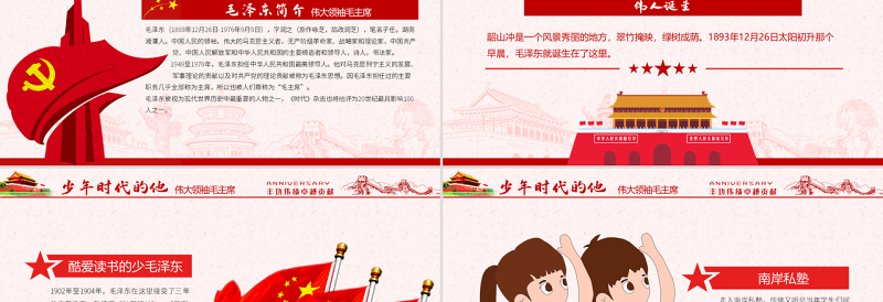 雖出身貧寒,卻有凌云壯志,以雄心與魄力帶領(lǐng)紅軍,進(jìn)行了長(zhǎng)征兩萬(wàn)五千里。經(jīng)百戰(zhàn)而愈奮,成就了輝煌的革命事業(yè)。您南征北戰(zhàn),帶著必勝的信念,去抗日救國(guó),指揮作戰(zhàn),建立了偉大的中華人民共和國(guó)。您偉大的毛主席,浩然正氣,胸納寰宇,遇千難而不挫,經(jīng)百戰(zhàn)而愈奮,成就了輝煌的革命事業(yè)。您青年時(shí)代的他豐功偉績(jī)卓越貢獻(xiàn)ANNIVERSARY偉大領(lǐng)袖毛主席