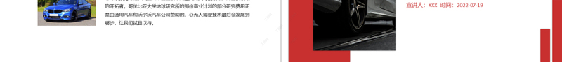 BUSINESS POWERPOINT無(wú)人駕駛汽車(chē)科技水平的發(fā)展迎來(lái)無(wú)人駕駛時(shí)代宣講人:XXX 時(shí)間:2022-07-19