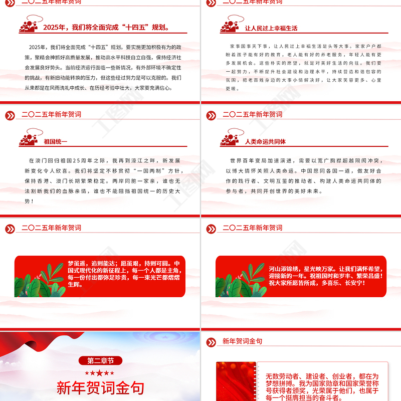 工圖網(wǎng)提供二〇二五年新年賀詞PPT紅色精美2025新年賀詞金句課件供會(huì)員免費(fèi)下載。更多精彩黨課PPT素材,盡在工圖網(wǎng)。