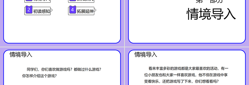 用你喜歡的方法讀文,邊讀邊想:你覺(jué)得這個(gè)游戲怎么樣?從哪些語(yǔ)句的描寫(xiě)中感受到的?游戲前你做哪些準(zhǔn)備。 在游戲中,做了些什么?印象比較深的是什么? 游戲結(jié)束后,有什么感受和想法?情境導(dǎo)入