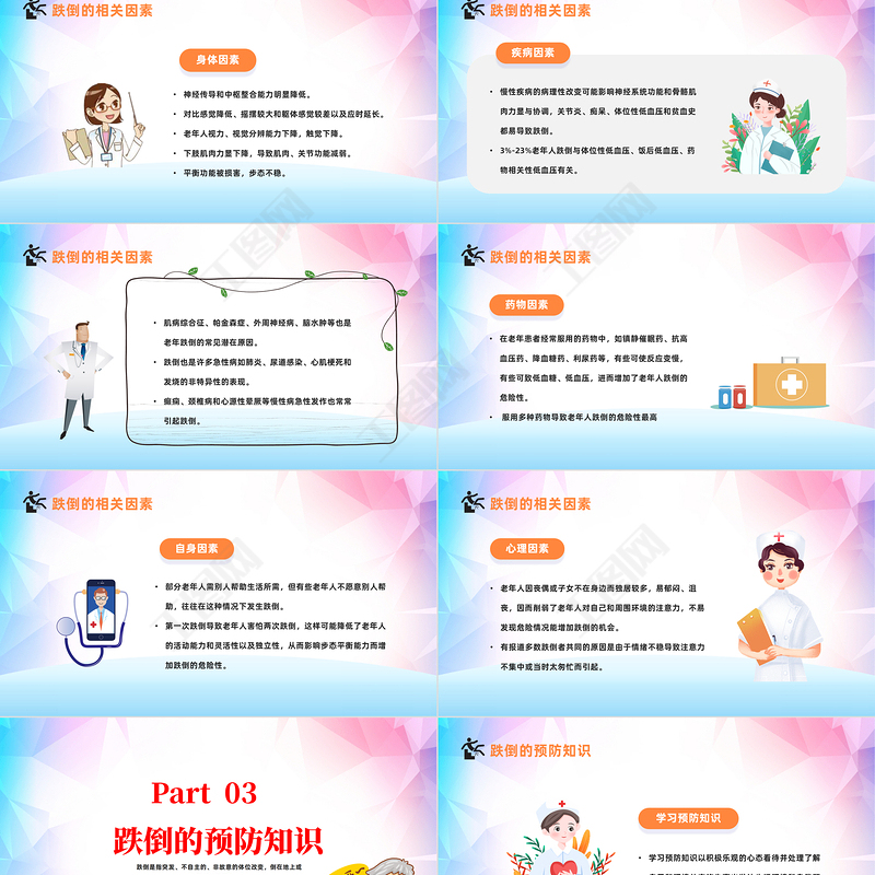 跌倒的預防知識學習預防知識以積極樂觀的心態(tài)看待并處理了解自己和環(huán)境從實施失事出發(fā)讓生活環(huán)境和自我預防完整和有利。學習預防知識