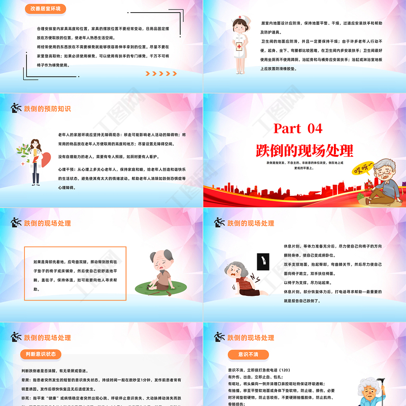 跌倒的現(xiàn)場處理降低老年人跌倒的發(fā)生重在預防; 采取有效的防范措施; 創(chuàng)造適合老年人特點的生活環(huán)境; 做好老年人健康、保健知識宣傳; 有效提高老年人生活質(zhì)量???結(jié)