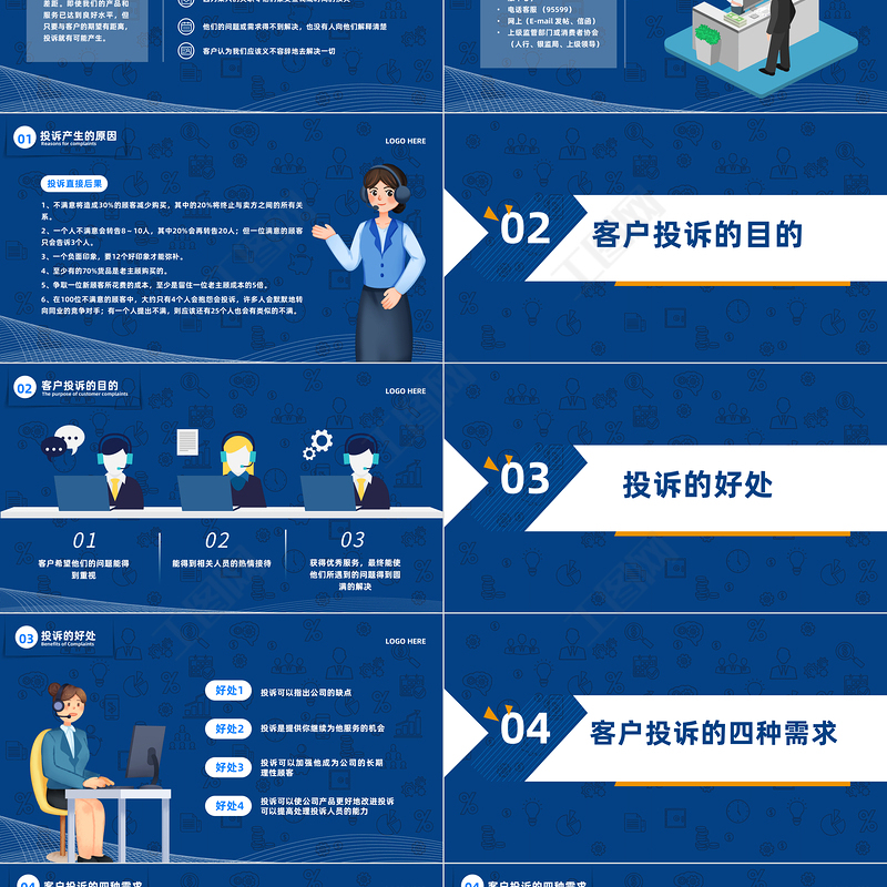 LOGO HERE投訴可以指出公司的缺點投訴是提供你繼續(xù)為他服務(wù)的機會投訴可以加強他成為公司的長期理性顧客投訴可以使公司產(chǎn)品更好地改進投訴可以提高處理投訴人員的能力