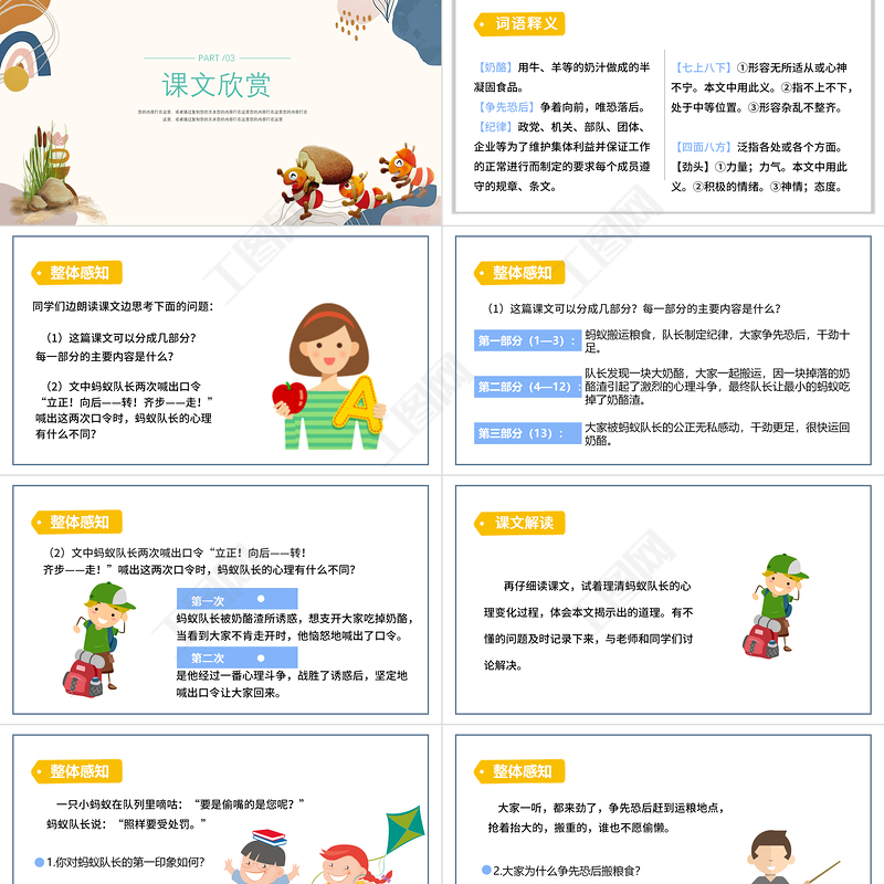 丟掉,實(shí)在太可惜;趁機(jī)吃掉它,又要犯不許偷嘴的禁令。怎么辦呢?他的心七上八下,只好下令:“休息一會兒!”他低下頭,嗅嗅那點(diǎn)兒奶酪渣子,味道真香!可是,他猶豫了一會兒,終于一跺腳:“注意啦,全體都有。稍息!立正!向后——轉(zhuǎn)!齊步——走!” 寫法點(diǎn)撥: 螞蟻隊(duì)長是本文的主要人物,文章運(yùn)用多種描寫手法來塑造螞蟻隊(duì)長的形象,如動作描寫、語言描寫、 心理描寫等。寫法巧借鑒