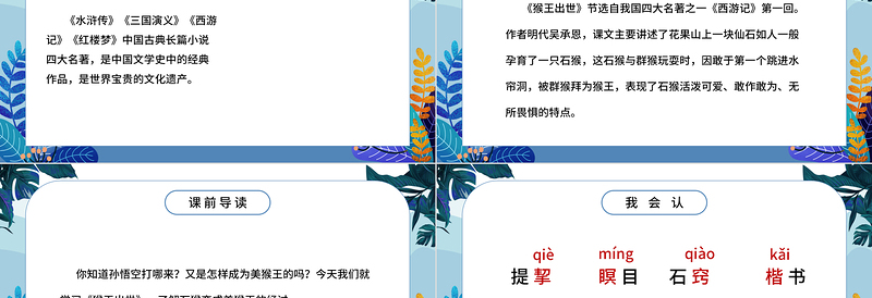 《猴王出世》節(jié)選自我國四大名著之一《西游記》第一回。作者明代吳承恩,課文主要講述了花果山上一塊仙石如人一般孕育了一只石猴,這石猴與群猴玩耍時(shí),因敢于第一個(gè)跳進(jìn)水簾洞,被群猴拜為猴王,表現(xiàn)了石猴活潑可愛、敢作敢為、無所畏懼的特點(diǎn)。課前導(dǎo)讀