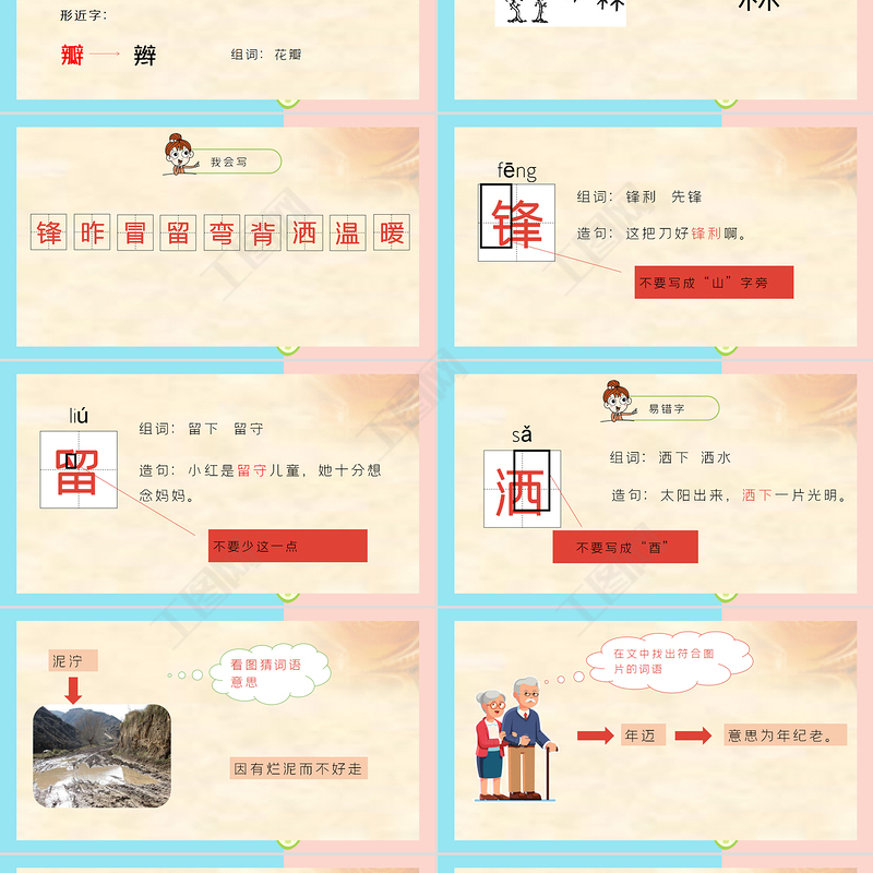 一、讀拼音,寫詞語。 雷( )叔叔( )抱迷路的孩子回家的故 事,( )了大家的心。mào yǔfēngwēn nuǎn鋒冒 雨溫 暖