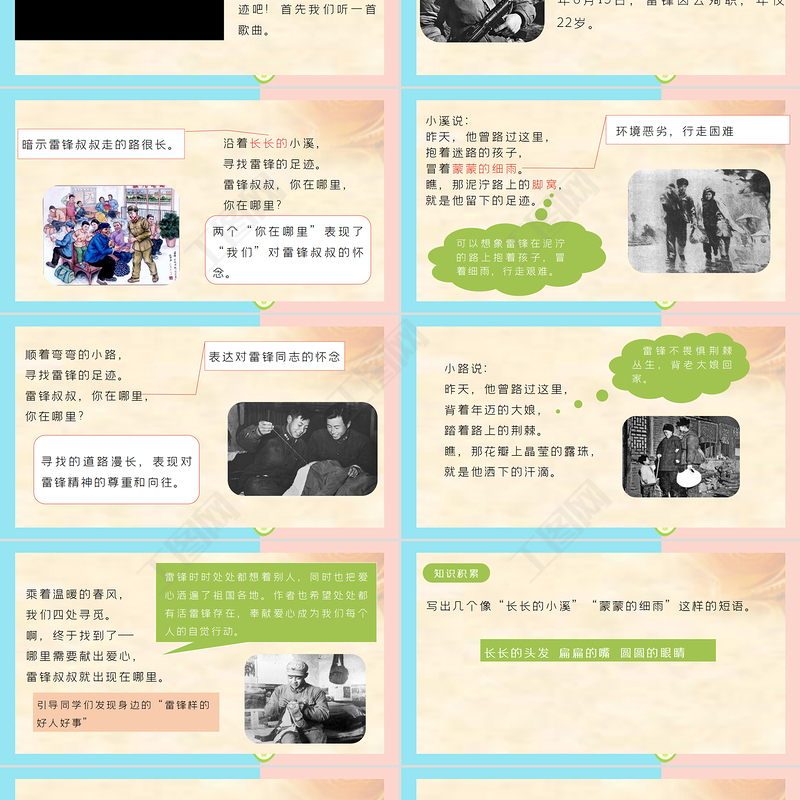 乘著溫暖的春風, 我們四處尋覓。 啊,終于找到了—— 哪里需要獻出愛心, 雷鋒叔叔就出現(xiàn)在哪里。 雷鋒時時處處都想著別人,同時也把愛心灑遍了祖國各地。作者也希望處處都有活雷鋒存在,奉獻愛心成為我們每個人的自覺行動。引導同學們發(fā)現(xiàn)身邊的“雷鋒樣的好人好事”