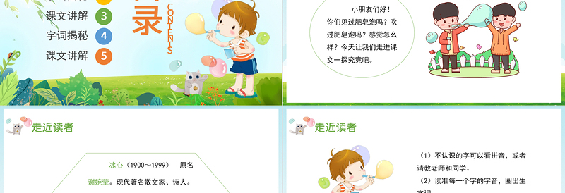 課前導(dǎo)讀 小朋友們好!你們見(jiàn)過(guò)肥皂泡嗎?吹過(guò)肥皂泡嗎?感覺(jué)怎么樣?今天讓我們走進(jìn)課文一探究竟吧。