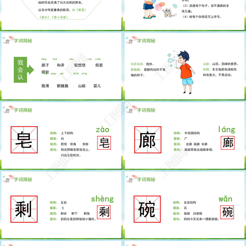 字詞揭秘山巔:山頂、頂峰的意思。 粘稠:本文指肥皂液粘性和濃度大,不易流動(dòng)。和弄和弄:攪拌。 顫巍巍:?震顫而動(dòng)作不準(zhǔn)確的樣子。