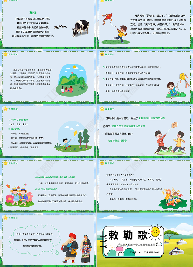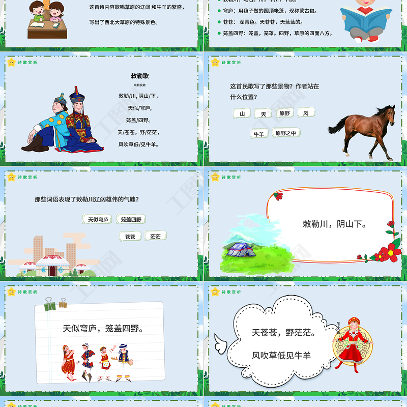 詩(shī)歌賞析敕勒歌 北朝民歌 敕勒/川, 陰山/下, 天似/穹廬, 籠蓋/四野。 天/蒼蒼,野/茫茫, 風(fēng)吹草低/見牛羊。