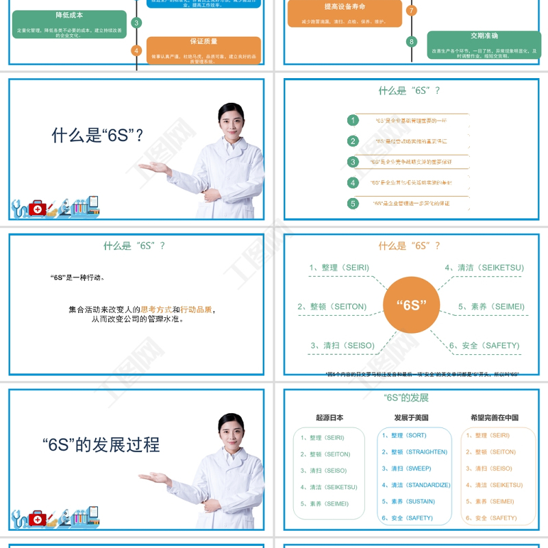 1、整理(SEIRI)3、清掃(SEISO)2、整頓(SEITON)6、安全(SAFETY)5、素養(yǎng)(SEIMEI)4、清潔(SEIKETSU)什么是“6S”?“6S”*因5個內(nèi)容的日文羅馬標注發(fā)音和最后一項“安全”的英文單詞都是“S”開頭,所以叫“6S”