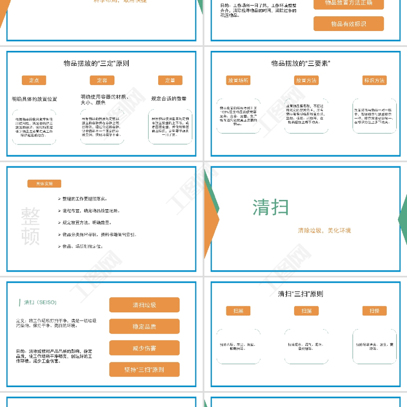 具體實施自己的工作場所范圍全面檢查,包括看到的和看不到的。指定“要”與“不要”的判定標準。將不要的物品清除出工作場所。對需要的物品根據(jù)使用頻率確定日常用量和放置位置。指定廢棄物處理方法。每日自我檢查。整理