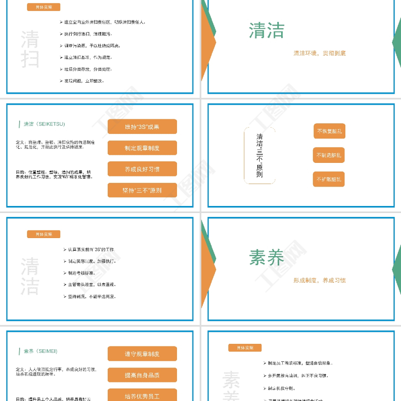 具體實施建立室內(nèi)室外清掃責任區(qū),明確清掃責任人。執(zhí)行例行清掃,清理臟污。調(diào)查污染源,予以杜絕或隔離。垃圾分類存放,分類處理。建立清掃基準,作為規(guī)范。發(fā)現(xiàn)問題,立即整改。清掃
