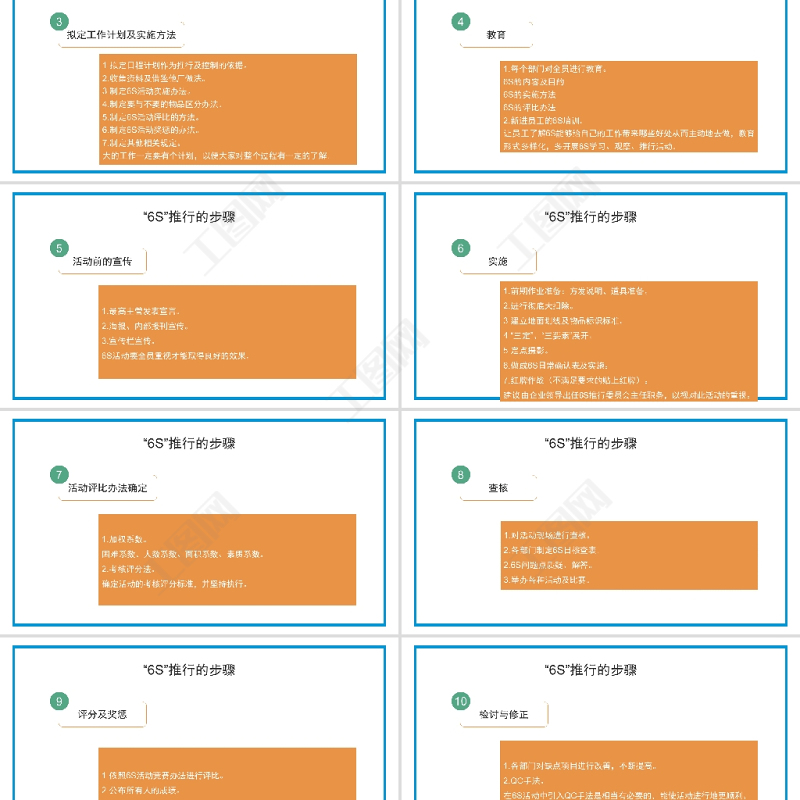 “6S”推行的步驟檢討與修正1.各部門對缺點項目進行改善,不斷提高。2.QC手法。在6S活動中引入QC手法是相當有必要的,能使活動進行地更順利、更有成效。