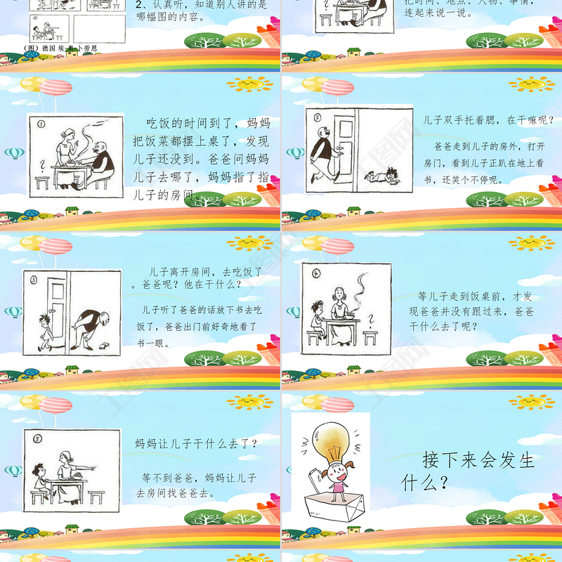 兒子離開房間,去吃飯了。爸爸呢?他在干什么? 兒子聽了爸爸的話放下書去吃飯了,爸爸出門前好奇地看了書一眼。