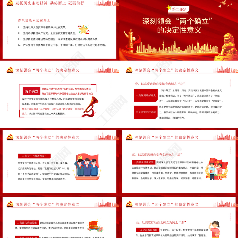 一是深刻理解意義“兩個確立”從理論、歷史、實踐維度為發(fā)展中國特色社會主義提供了根本保證。有了“兩個確立”,民族復(fù)興就有了“掌舵者”、人民群眾就有了“主心骨”、興黨強黨就有了“定盤星”。壹、以高度政治自覺培育忠誠之“心”二是對黨絕對忠誠機關(guān)黨員干部要將講政治放在首位,站穩(wěn)政治立場、保持政治定力,善于從政治上觀察形勢、明確方向,不斷增強政治判斷力、政治領(lǐng)悟力、政治執(zhí)行力。