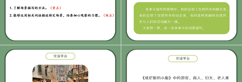 交流平臺 本單元描寫的景物中,有的呈現(xiàn)了自然風(fēng)光的靜態(tài)美,有的呈現(xiàn)了自然風(fēng)光的動態(tài)美,有的是將美麗的自然風(fēng)光與人們的活動融為一體。 大家想一想,說一說本單元的場景描寫。