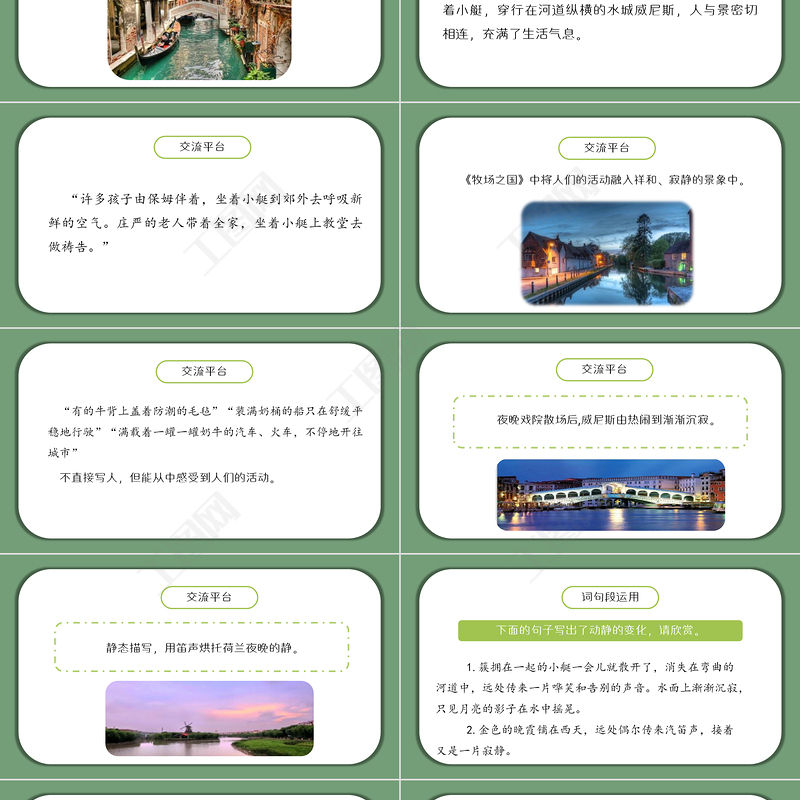 《威尼斯的小艇》中的游客、商人、婦女、老人乘著小艇,穿行在河道縱橫的水城威尼斯,人與景密切相連,充滿了生活氣息。交流平臺