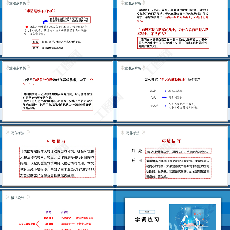 環(huán)境描寫(xiě)環(huán)境描寫(xiě)是指對(duì)人物活動(dòng)的自然環(huán)境、社會(huì)環(huán)境和人物活動(dòng)的時(shí)間、地點(diǎn)、當(dāng)時(shí)情景等進(jìn)行有目的的描繪,以起到渲染氣氛烘托人物心情的作用。本文就有三處環(huán)境描寫(xiě),突出了白求恩堅(jiān)守陣地的精神,對(duì)自己的工作極端負(fù)責(zé)任的優(yōu)秀品質(zhì)。