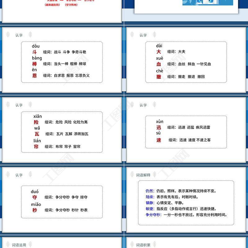 陸續(xù):表示有先有后,時(shí)斷時(shí)續(xù)。鎮(zhèn)靜:心情安定、平靜。爭(zhēng)分奪秒:一分一秒也不放過(guò)。形容充分利用時(shí)間。仍然:仍舊,照樣。表示某種情況持續(xù)不變。敏捷:指反應(yīng)(多指動(dòng)作或言行)迅速快捷。