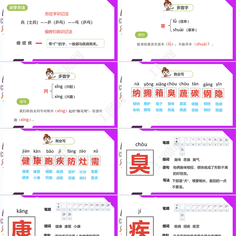 組詞疾病 頑疾 疾苦 造句 許多危險(xiǎn)的疾病是由昆蟲傳播的。疾jí筆順寫法 “疒”要寫得寬大些。