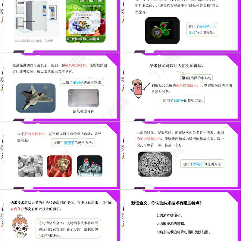 默讀全文,你認(rèn)為納米技術(shù)有哪些特點(diǎn)? 1.納米本身很小。 2.納米技術(shù)的高超。 3.納米技術(shù)的奇異功能和美妙前景。