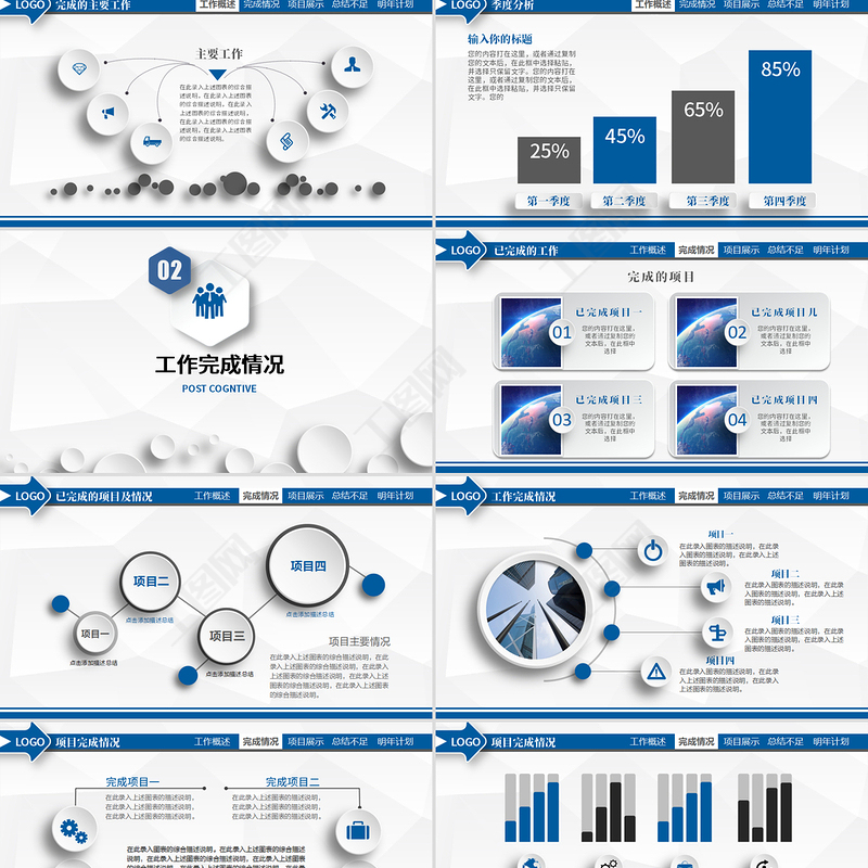 工作完成情況LOGO項(xiàng)目一在此錄入圖表的描述說(shuō)明,在此錄入圖表的描述說(shuō)明,在此錄入上述圖表的描述說(shuō)明。項(xiàng)目四在此錄入圖表的描述說(shuō)明,在此錄入上述圖表的描述說(shuō)明,在此錄入上述圖表的描述說(shuō)明。項(xiàng)目二在此錄入圖表的描述說(shuō)明,在此錄入圖表的描述說(shuō)明,在此錄入上述圖表的描述說(shuō)明。項(xiàng)目三在此錄入圖表的描述說(shuō)明,在此錄入圖表的描述說(shuō)明,在此錄入上述圖表的描述說(shuō)明。