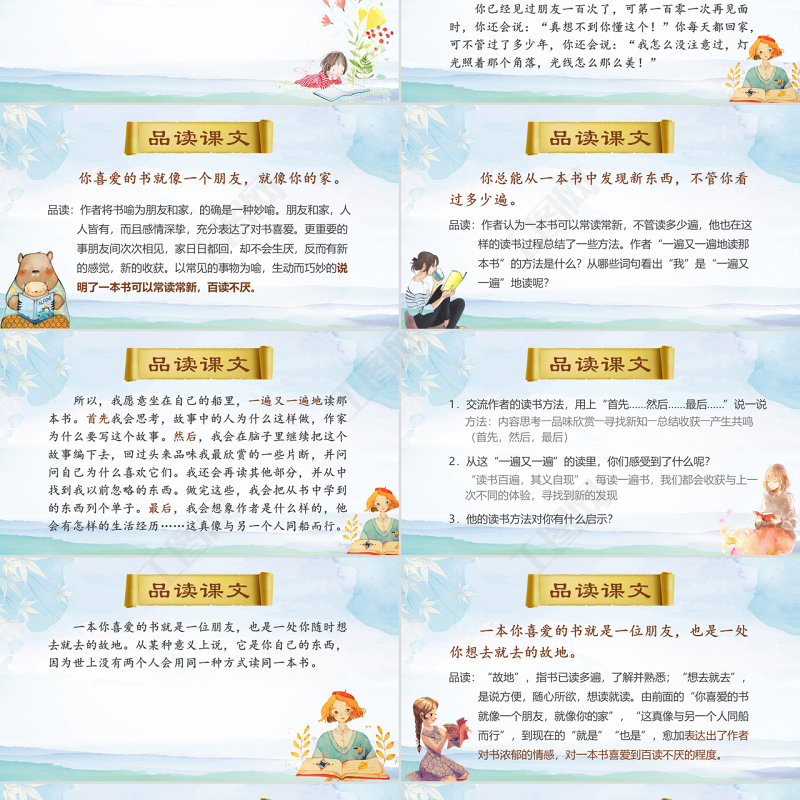 品讀課文 一本你喜愛的書就是一位朋友,也是一處你隨時想去就去的故地。從某種意義上說,它是你自己的東西,因為世上沒有兩個人會用同一種方式讀同一本書。