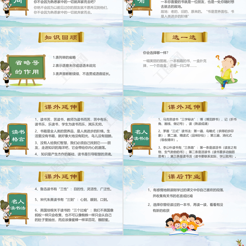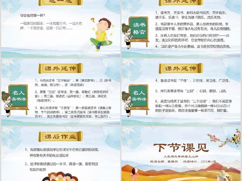 課外延伸1、讀書苦,苦讀書,教師為讀書而苦,苦中有樂;讀書樂,樂讀書,學(xué)生為讀書而樂,其樂無窮。讀書格言2、書籍是全人類的營養(yǎng)品,是人類進(jìn)步的階梯。生活里沒有書籍,就好像大地沒有陽光,鳥兒沒有翅膀。3、沒有人給我們智慧,我們必須自己找到它——朋友,走進(jìn)知識的海洋吧,它會帶給你內(nèi)心的激蕩。4、 知識是產(chǎn)生杰作的基礎(chǔ),讀書是引導(dǎo)聰慧的靈魂。