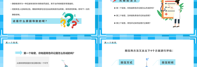 第二個(gè)秘密第二個(gè)秘密,怎樣避免青色印記的出現(xiàn)呢?所穿刺靜脈的解剖特點(diǎn)及其與之相伴行的動脈間的解剖關(guān)系,根據(jù)解剖特點(diǎn)進(jìn)行操作如一側(cè)穿刺不成功,可改為對側(cè),禁止在原穿刺點(diǎn)反復(fù)穿刺,以避免出現(xiàn)血腫,局部隆起疑有血腫應(yīng)立即停止穿刺,拔針后局部加壓止血。