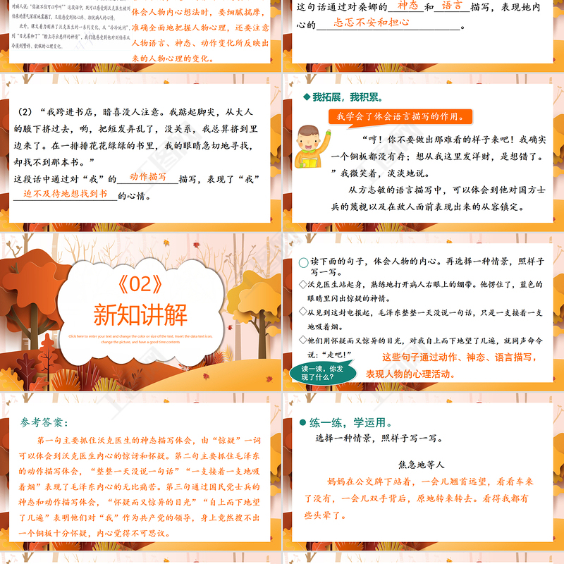 沃克醫(yī)生站起身,熟練地打開病人右眼上的繃帶。他愣住了,藍(lán)色的眼睛里閃出驚疑的神情。從見到這封電報起,毛澤東整整一天沒說一句話,只是一支接著一支地吸著煙。他們用懷疑而又驚異的目光,對我自上而下地望了幾遍,就同聲命令說:“走吧!”讀下面的句子,體會人物的內(nèi)心。再選擇一種情景,照樣子寫一寫。這些句子通過動作、神態(tài)、語言描寫,表現(xiàn)人物的心理活動。讀一讀,你發(fā)現(xiàn)了什么?