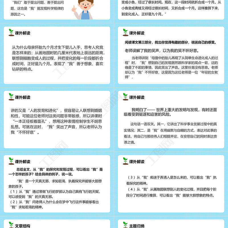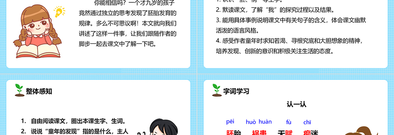你能相信嗎?一個才九歲的孩子竟然通過獨立的思考發(fā)現(xiàn)了胚胎發(fā)育的規(guī)律。多么不可思議??!本文就向我們講述了這樣一件事,讓我們跟隨作者的腳步一起去課文中了解一下吧。