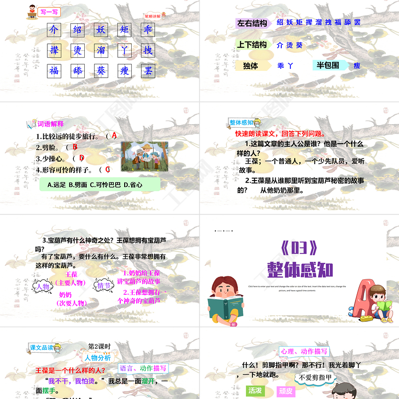 奶奶給王葆講了張三、李四、王五、趙六獲得寶葫蘆的故事。 提示:創(chuàng)編故事時(shí),要把故事情節(jié)寫得曲折一些,想象要奇特,同時(shí)要傳達(dá)出積極向上的主旨。