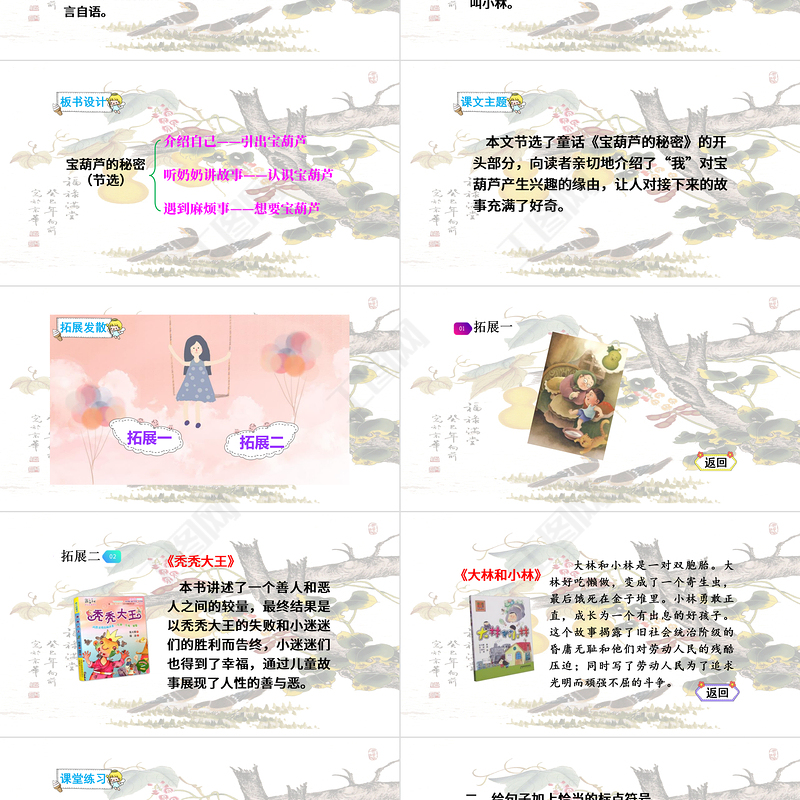 寶葫蘆的秘密 (節(jié)選)介紹自己——引出寶葫蘆聽奶奶講故事——認(rèn)識(shí)寶葫蘆遇到麻煩事——想要寶葫蘆