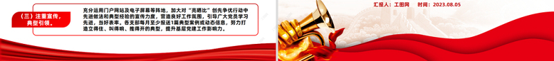 工圖網(wǎng)提供“亮?xí)癖取眲?chuàng)先爭優(yōu)行動方案PPT紅色精美基層黨建晾曬比提質(zhì)增效課件供會員免費(fèi)下載。更多精彩黨課PPT素材,盡在工圖網(wǎng)。