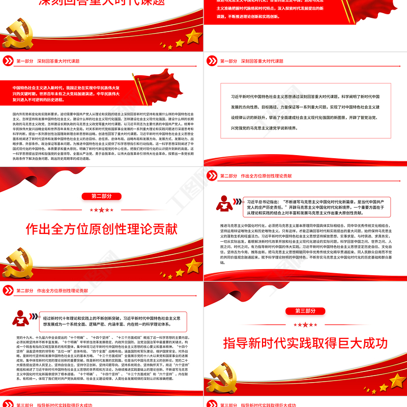 第二部分 作出全方位原創(chuàng)性理論貢獻(xiàn)黨的十九大、十九屆六中全會(huì)提出的“十個(gè)明確”、“十四個(gè)堅(jiān)持”、“十三個(gè)方面成就”概括了這一科學(xué)思想的主要內(nèi)容,必須長期堅(jiān)持并不斷豐富發(fā)展。“十個(gè)明確”牢牢抓住改革發(fā)展穩(wěn)定、內(nèi)政外交國防、治黨治國治軍中最重要的關(guān)鍵點(diǎn),構(gòu)成一個(gè)既各有指向又相互聯(lián)系的有機(jī)整體,集中體現(xiàn)習(xí)近平新時(shí)代中國特色社會(huì)主義思想的核心要義和基本精神?!笆膫€(gè)堅(jiān)持”涵蓋堅(jiān)持黨的領(lǐng)導(dǎo)和“五位一體”總體布局、“四個(gè)全面”戰(zhàn)略布局,涵蓋國防和軍隊(duì)建設(shè)、維護(hù)國家安全、對(duì)外戰(zhàn)略,是新時(shí)代堅(jiān)持和發(fā)展中國特色社會(huì)主義的基本方略。“十三個(gè)方面成就”全面展示黨的十八大以來黨和國家事業(yè)的進(jìn)展成效,集中體現(xiàn)新時(shí)代黨的理論創(chuàng)新的重要突破,既是新時(shí)代發(fā)展的實(shí)踐篇,也是當(dāng)代中國馬克思主義的創(chuàng)新論。黨的二十大報(bào)告提出堅(jiān)持人民至上、堅(jiān)持自信自立、堅(jiān)持守正創(chuàng)新、堅(jiān)持問題導(dǎo)向、堅(jiān)持系統(tǒng)觀念、堅(jiān)持胸懷天下,用這“六個(gè)堅(jiān)持”概括和闡述了習(xí)近平新時(shí)代中國特色社會(huì)主義思想的世界觀和方法論,為繼續(xù)推進(jìn)實(shí)踐基礎(chǔ)上的理論創(chuàng)新、不斷譜寫馬克思主義中國化時(shí)代化新篇章提供了根本遵循?!笆畟€(gè)明確”、“十四個(gè)堅(jiān)持”、“十三個(gè)方面成就”和“六個(gè)堅(jiān)持”,內(nèi)在聯(lián)系、有機(jī)統(tǒng)一,體現(xiàn)了我們黨對(duì)共產(chǎn)黨執(zhí)政規(guī)律、社會(huì)主義建設(shè)規(guī)律、人類社會(huì)發(fā)展規(guī)律的深刻認(rèn)識(shí)和準(zhǔn)確把握。經(jīng)過新時(shí)代十年理論和實(shí)踐上的不斷創(chuàng)新突破,習(xí)近平新時(shí)代中國特色社會(huì)主義思想發(fā)展成為一個(gè)系統(tǒng)全面、邏輯嚴(yán)密、內(nèi)涵豐富、內(nèi)在統(tǒng)一的科學(xué)理論體系。