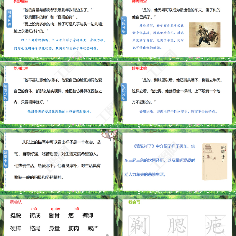 句段分析“他的身量與筋肉都發(fā)展到年歲前邊去了?!?“鐵扇面似的胸”和“直硬的背”。 “腮上沒有多余的肉,脖子可是幾乎與頭一邊兒粗;臉上永遠紅撲撲的?!币陨先幫饷裁鑼懀梢钥闯鱿樽由聿母叽?,身強力壯,同時也說明祥子很能吃苦,從側(cè)面寫出祥子的吃苦耐勞。外貌描寫