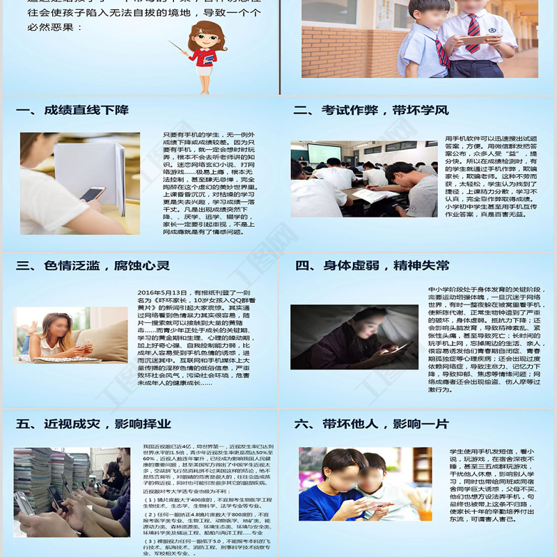 一、成績直線下降只要有手機(jī)的學(xué)生,無一例外成績下降或成績較差。因?yàn)橹灰惺謾C(jī),就一定會(huì)想時(shí)時(shí)玩弄,根本不會(huì)去聽老師講的知識(shí)。迷戀網(wǎng)絡(luò)玄幻小說、打網(wǎng)絡(luò)游戲……極易上癮,根本無法控制,甚至肆無忌憚,完全陶醉在這個(gè)虛幻的美妙世界里。上課昏昏沉沉,對枯燥的學(xué)習(xí)更是失去興趣,學(xué)習(xí)成績一落千丈。凡是出現(xiàn)成績突然下降、、厭學(xué)、逃學(xué)、輟學(xué)的,家長一定要引起重視,不是上網(wǎng)成癮就是有了情感問題。