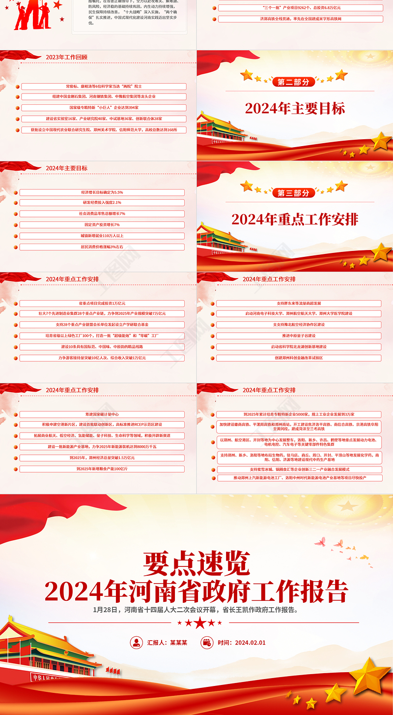 工圖網(wǎng)提供2024年河南省政府工作報告要點速覽PPT紅色精美工作報告課件供會員免費下載。更多精彩黨課PPT素材,盡在工圖網(wǎng)。