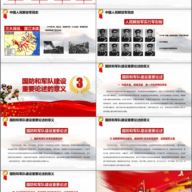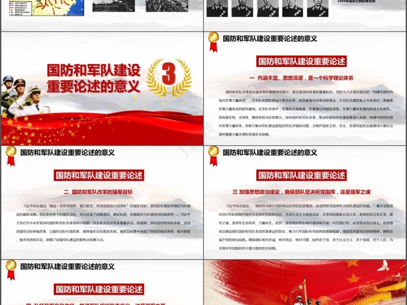 國防和軍隊建設(shè)重要論述的意義國防和軍隊建設(shè)重要論述 國防和軍隊改革是全面改革的重要組成部分,是全面深化改革的重要標(biāo)志。黨的十八大報告提出的“構(gòu)建中國特色現(xiàn)代軍事力量體系”,在軍隊和國防建設(shè)中推進(jìn)改革,就是要強化改革創(chuàng)新理念,不僅在武器裝備上升級換代,更要看軍事力量體系的架構(gòu)重組。在軍隊改革中,軍事技術(shù)是根基,軍事理論構(gòu)想是藍(lán)圖,軍事力量體系重構(gòu)則是主體建筑,具有根本性、全局性、整體性和決定性意義。深化國防和軍隊改革,推動中國特色軍事變革深入發(fā)展,構(gòu)建中國特色現(xiàn)代軍事力量體系,有助于解決軍隊建設(shè)面臨的突出矛盾和問題,為維護(hù)國家主權(quán)、安全、發(fā)展利益和全面建成小康社會提供重要力量支撐和堅強安全保障。一 內(nèi)涵豐富、思想深邃,是一個科學(xué)理論體系