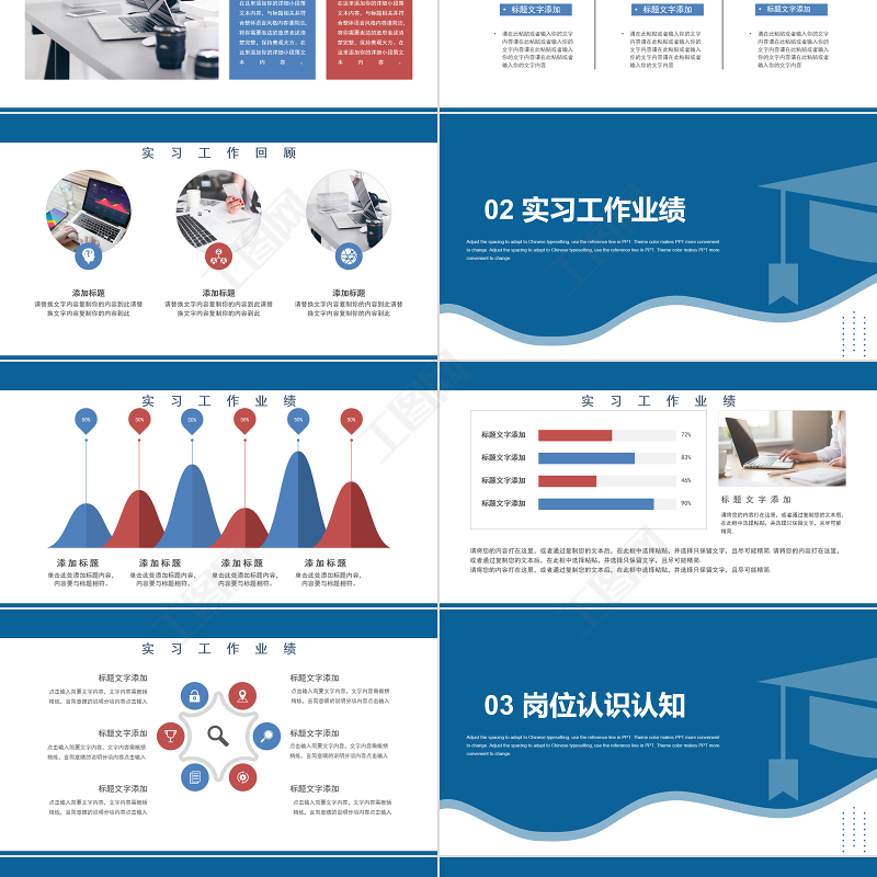 Adjust the spacing to adapt to Chinese typesetting, use the reference line in PPT. Theme color makes PPT more convenient to change. Adjust the spacing to adapt to Chinese typesetting, use the reference line in PPT. Theme color makes PPT more convenient to change. 02 實(shí)習(xí)工作業(yè)績(jī)