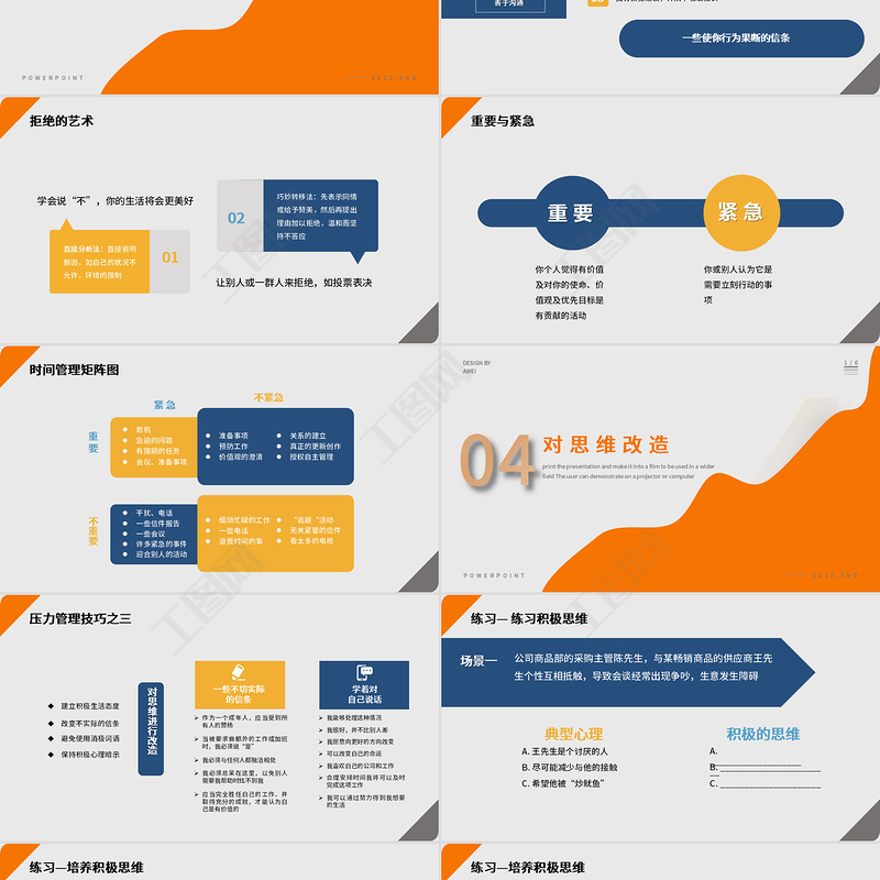 CONTENTS目錄1/6POWERPOINT2020.END對思維改造緩解壓力的方法面對壓力控制情緒的技巧員工壓力管理的方法有關(guān)壓力避開壓力源提高相應(yīng)能力
