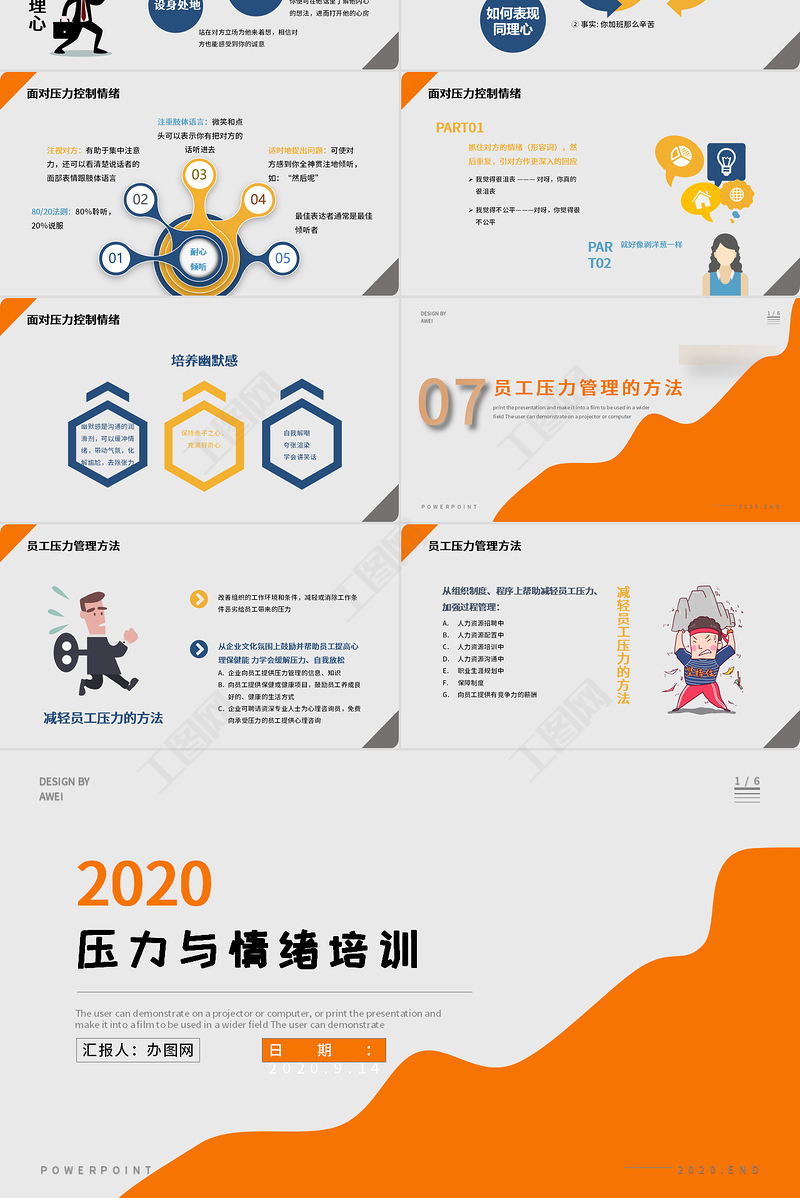 1/6DESIGN BYAWEIPOWERPOINT2020.END壓力與情緒培訓(xùn)The user can demonstrate on a projector or computer, or print the presentation and make it into a film to be used in a wider field The user can demonstrate2020匯報人:辦圖網(wǎng)日期:2020.9.14