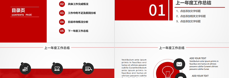 目錄頁CONTENTS PAGE 上一年度工作總結(jié)具體工作完成情況工作中的不足及原因分析目前市場情況分析下一年度工作總結(jié)