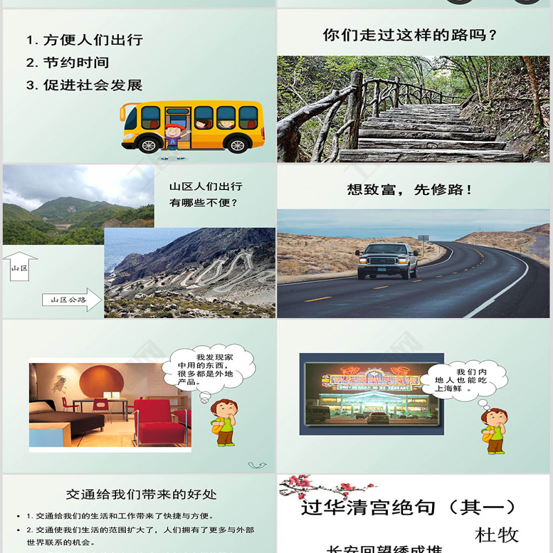 交通給我們帶來的好處1.交通給我們的生活和工作帶來了快捷與方便。2.交通使我們生活的范圍擴大了,人們擁有了更多與外部世界聯(lián)系的機會。3.交通促進了人們的交流,拉近了人與人之間的距離。4.交通使我們有可能品嘗到其他地方的特產(chǎn)。5.交通不僅為我們帶來所需要的物品,而且也為我們提供了更多的選擇。