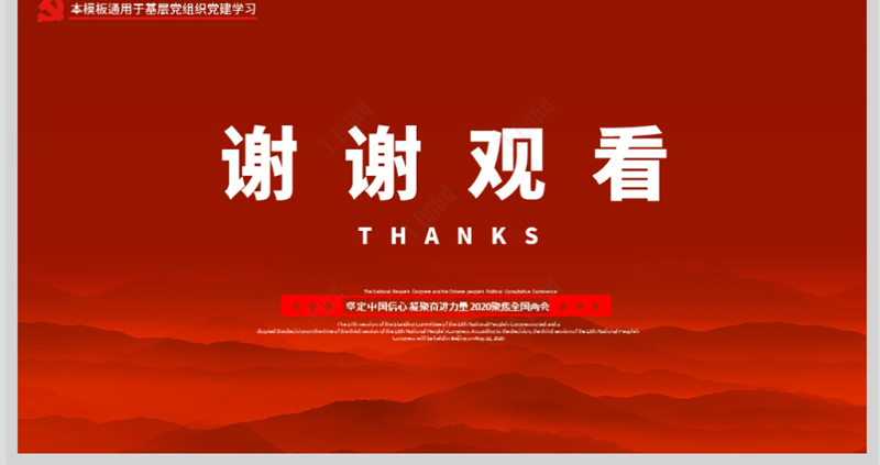 THANKS謝謝觀看堅(jiān)定中國信心 凝聚奮進(jìn)力量 2020聚焦全國兩會(huì)The 17th session of the Standing Committee of the 13th National People's Congress voted and adopted the decision on the time of the third session of the 13th National People's Congress. According to the decision, the third session of the 13th National People’s Congress will be held in Beijing on May 22, 2020The National People's Congress and the Chinese people's Political Consultative Conference