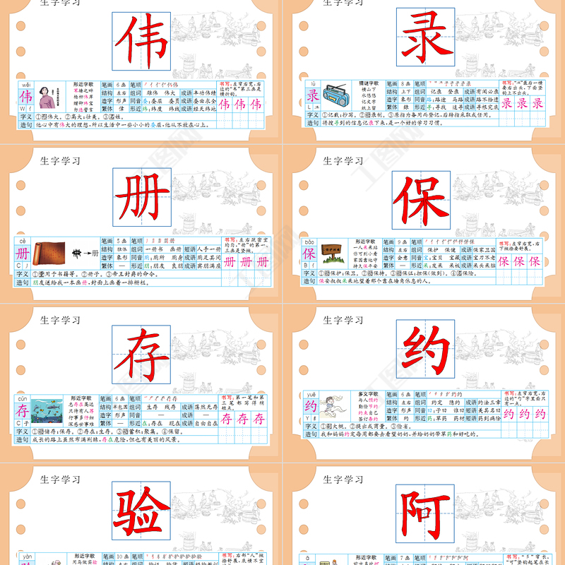 詞語理解創(chuàng)造:發(fā)明、制造了前所未有的事物。 造句:中華民族創(chuàng)造了輝煌的歷史。 鑄刻:在金屬上刻、鑄文字。 造句:鑄刻在青銅器上的文字被稱為金文。 攜帶:隨身帶著。 造句:圖書館禁止攜帶寵物進入。